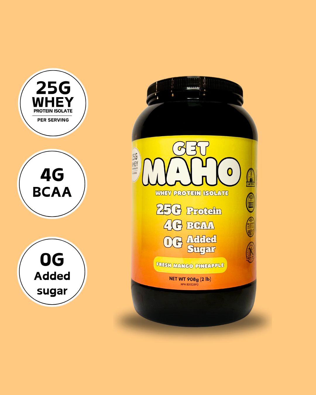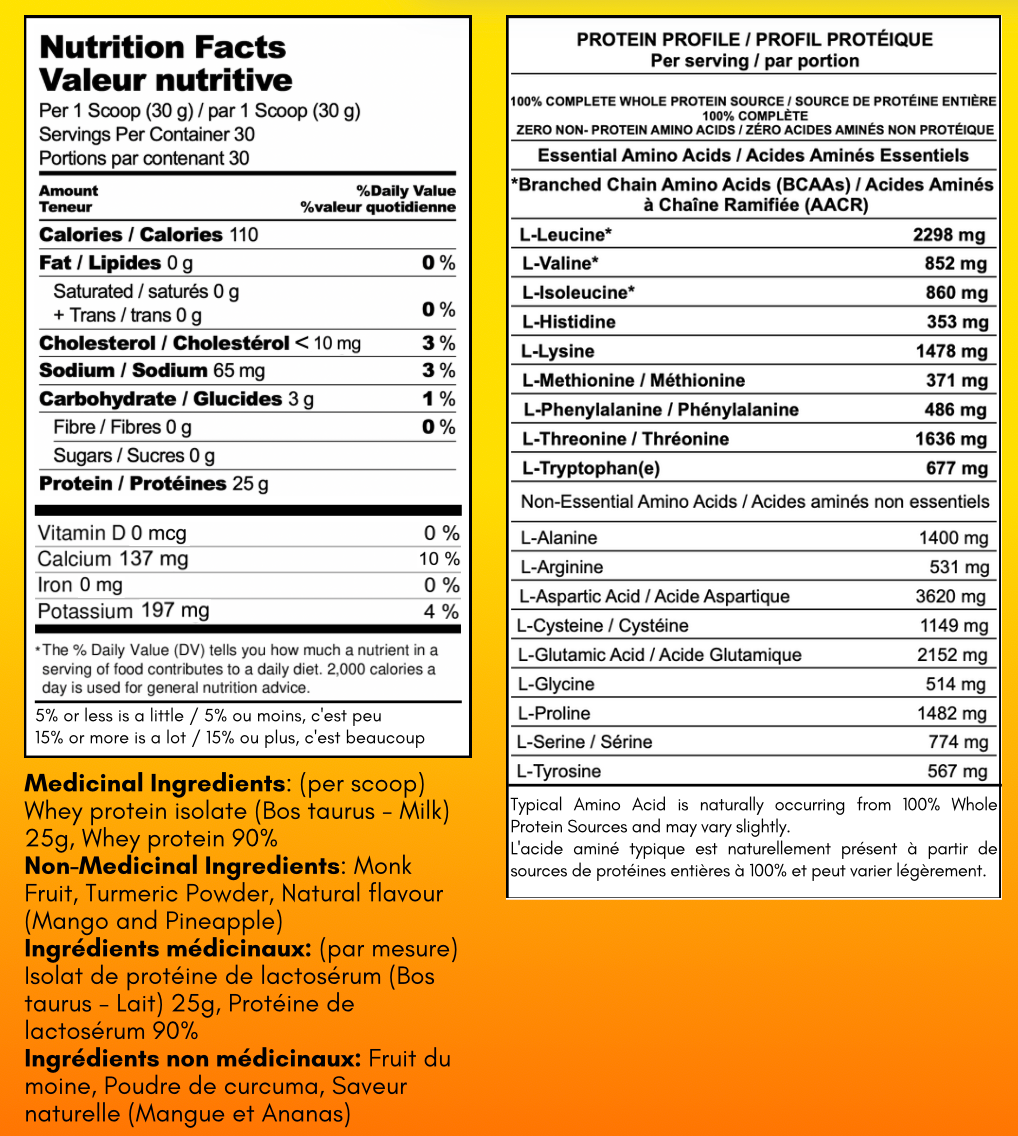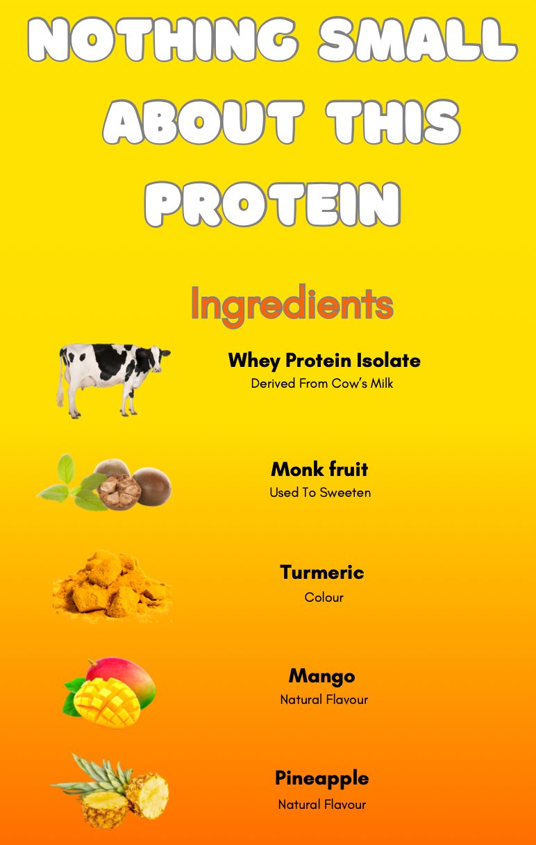 Ingredients Include: Whey Protein Isolate, Monk fruit, Natural Flavour; Mango and Pineapple, Turmeric Powder
